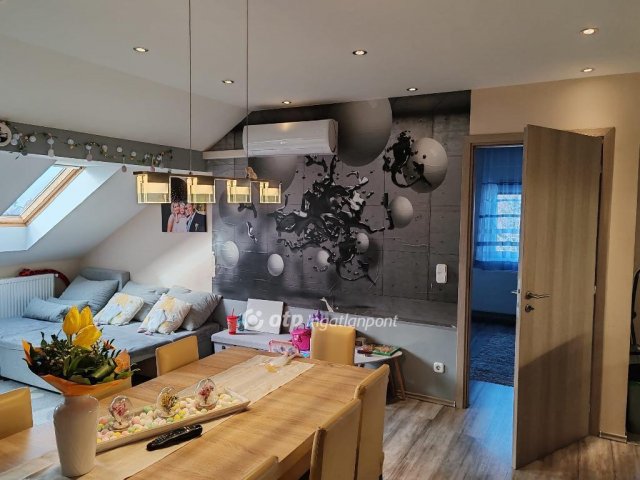 A tetőtér jelenleg lakott, itt található nagy nappali-konyha-étkező egyben. Kényelmes minden igényt kielégítő nagyméretű konyha van. A nappalit a konyhától az étkező választja el. Ebből a közös lakrészből nyílnak a 3 db hálószoba és a fürdőszoba. Van külön wc, tároló, speiz.