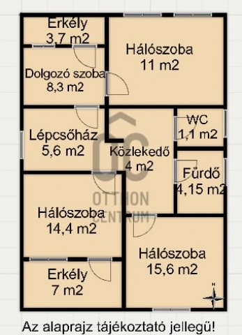 emelet helyiségei: 3 hálószoba, ebből kettő erkélykapcsolatos, 1 dolgozószoba, fürdő, WC