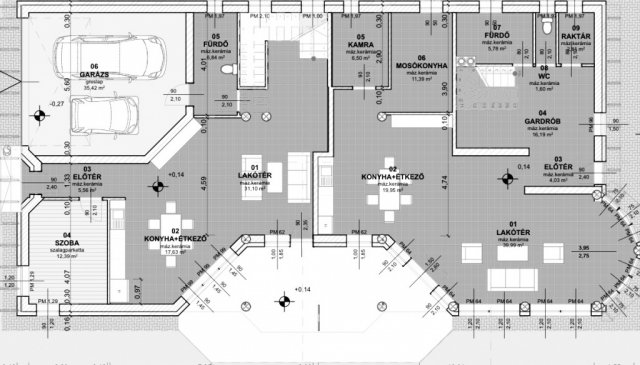 Az egyik lakrészhez az 50 nm nappali mellett fűtött, dupla, motoros távműködtetésű ajtóval zárt, 2 autó beállására alkalmas garázs és 300 nm-es telekterület, összességében 48 nm terasz tartozik. A másik lakrész 828 nm-es telekterületen, összességében 65 nm-es terasszal kialakított, nappali itt közel 70 nm-es, központi porszívó és központi szennyes ledobó.