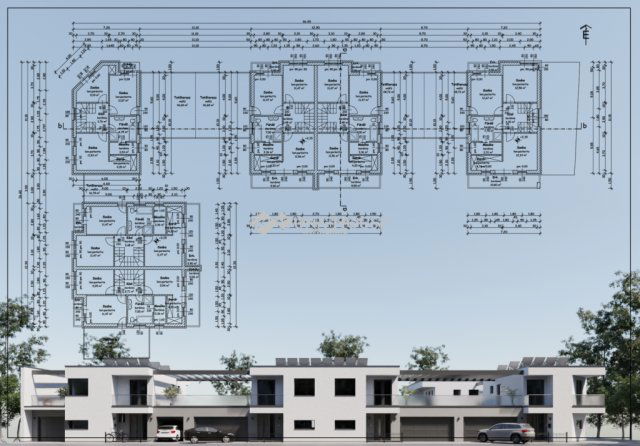 A tervezett épület hat kétszintes lakást tartalmaz. Az épület lakásonként gépkocsitárolót, 3 hálószobát, egy légterű nappali, konyha, étkező tereket, háztartási helyiséget, fürdőszobát, külön WC-t tartalmaz.