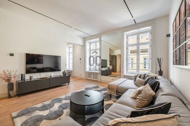 Kivételes lehetőség! Eladó egy 78 m²-es, 3 szobás, teljes körűen felújított luxuslakás, a Gresham palotánál, egy liftes, új, és 24 órás recepcióval rendelkező, csodaszép, felújított épületben. A lakás a 3. emeleten található, és egy tágas nappalit, két hálószobát, valamint egy fürdőszobát tartalmaz. A nappali és az egyik hálószoba utcai nézetű, így egyedülálló panorámát kínálnak a városra.