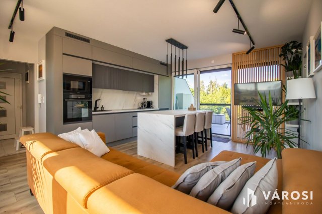 A konyhabútor is méretre készült és a legkorszerűbb gépekkel van felszerelve, amik természetesen itt maradnak szintén. A nappaliban igényes ülőgarnitúra csábít a pihenésre, tévézésre.