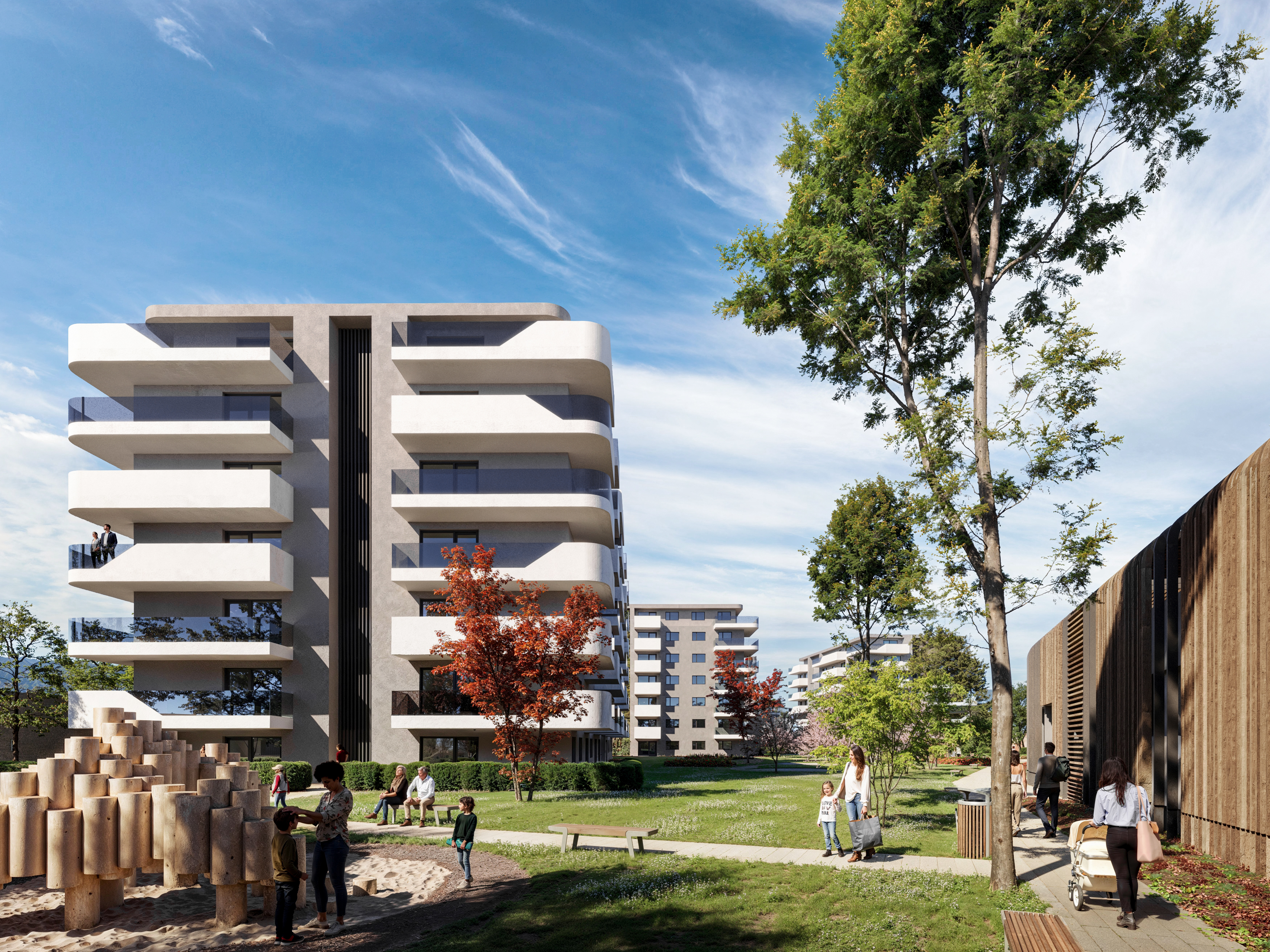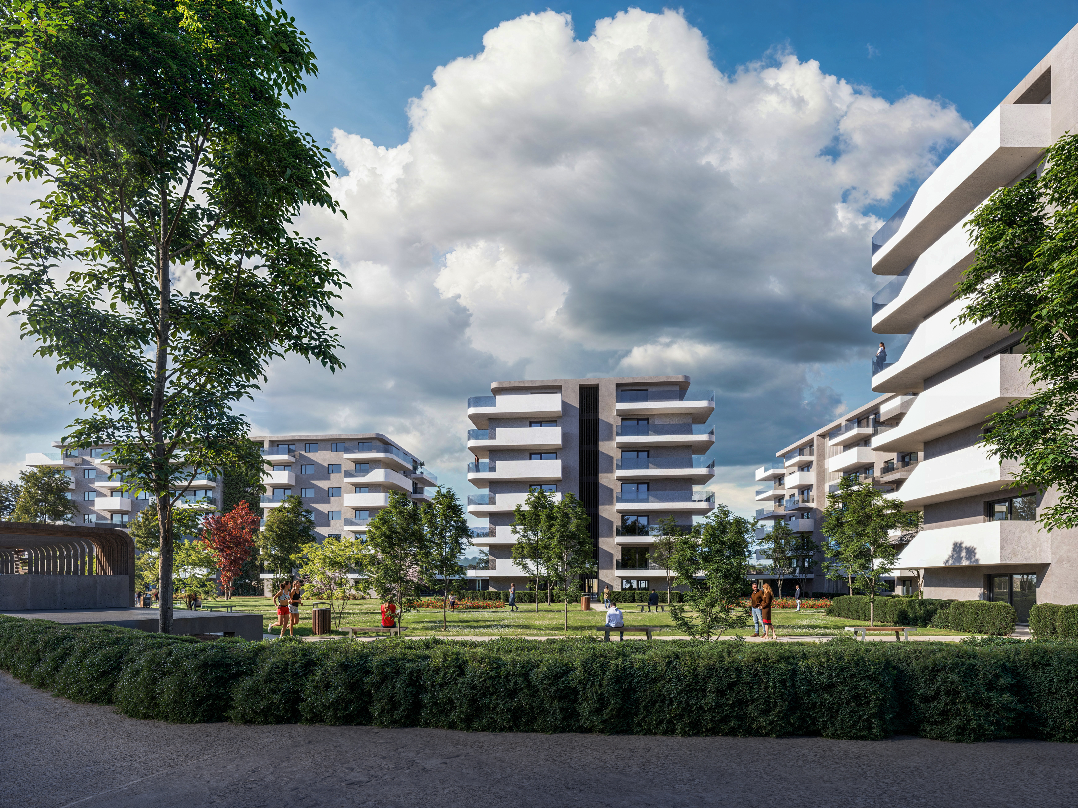 A 251 lakásos társasház egy új, formálódó városi közösség alapja. A zöldfelületek, a csendes belső terek és a korszerű műszaki megoldások kiegyensúlyozott mindennapokat tesznek lehetővé.