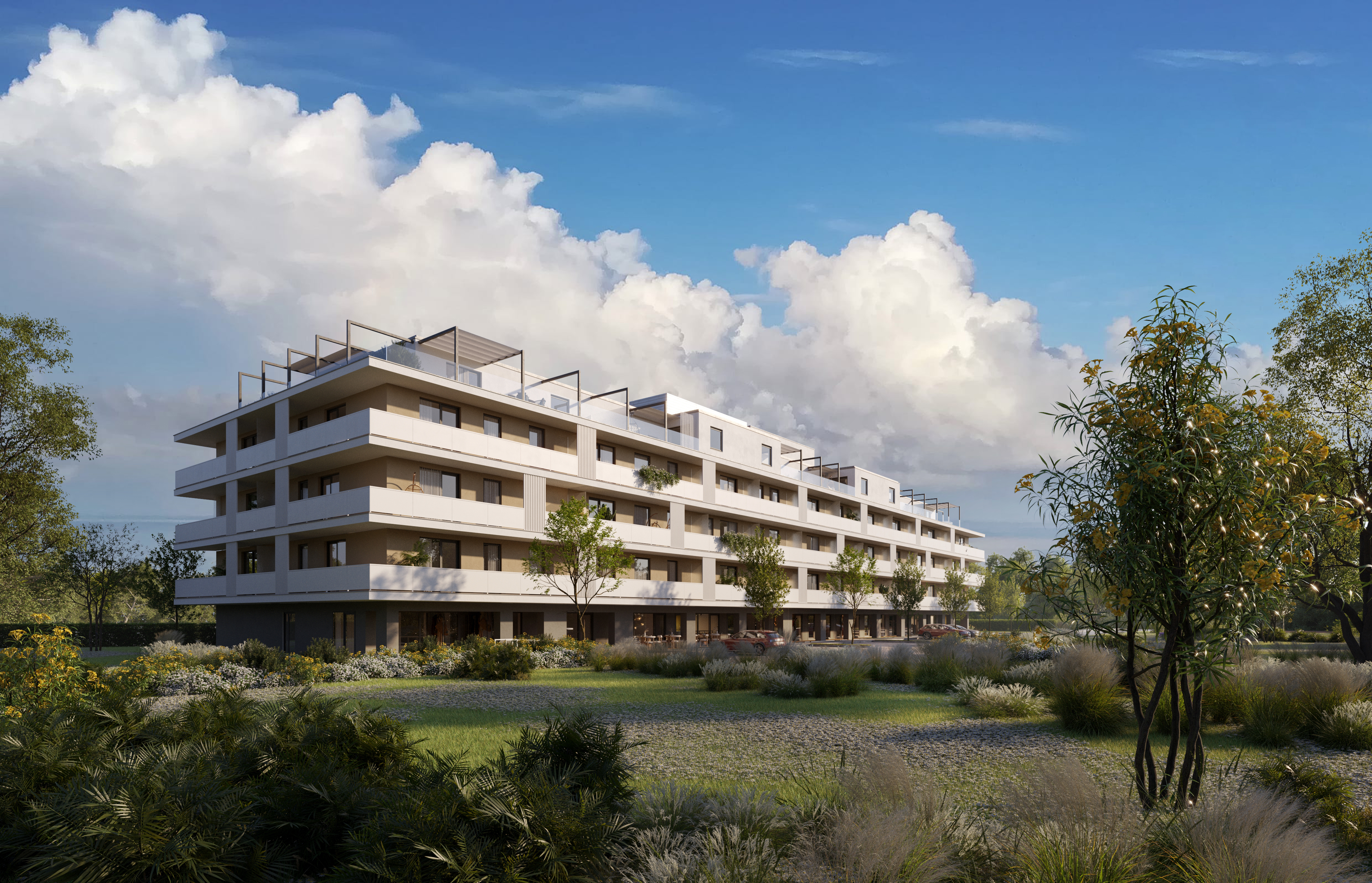 A földszinti lakások kertkapcsolatosak, míg az emeleteken minden lakás nagy erkéllyel, a legfelső szinti penthouse-ok tágas tetőterasszal rendelkeznek. A lakásválaszték 30-88 négyzetméter között mozog és az 1 szobás garzontól a 2, 3 és 4 szobás otthonokig terjed. Ezáltal egyedülállóknak, fiatal vagy idősebb pároknak és többgyermekes családoknak egyaránt elérhető a megfelelő méretű és szobaszámú lakás.
