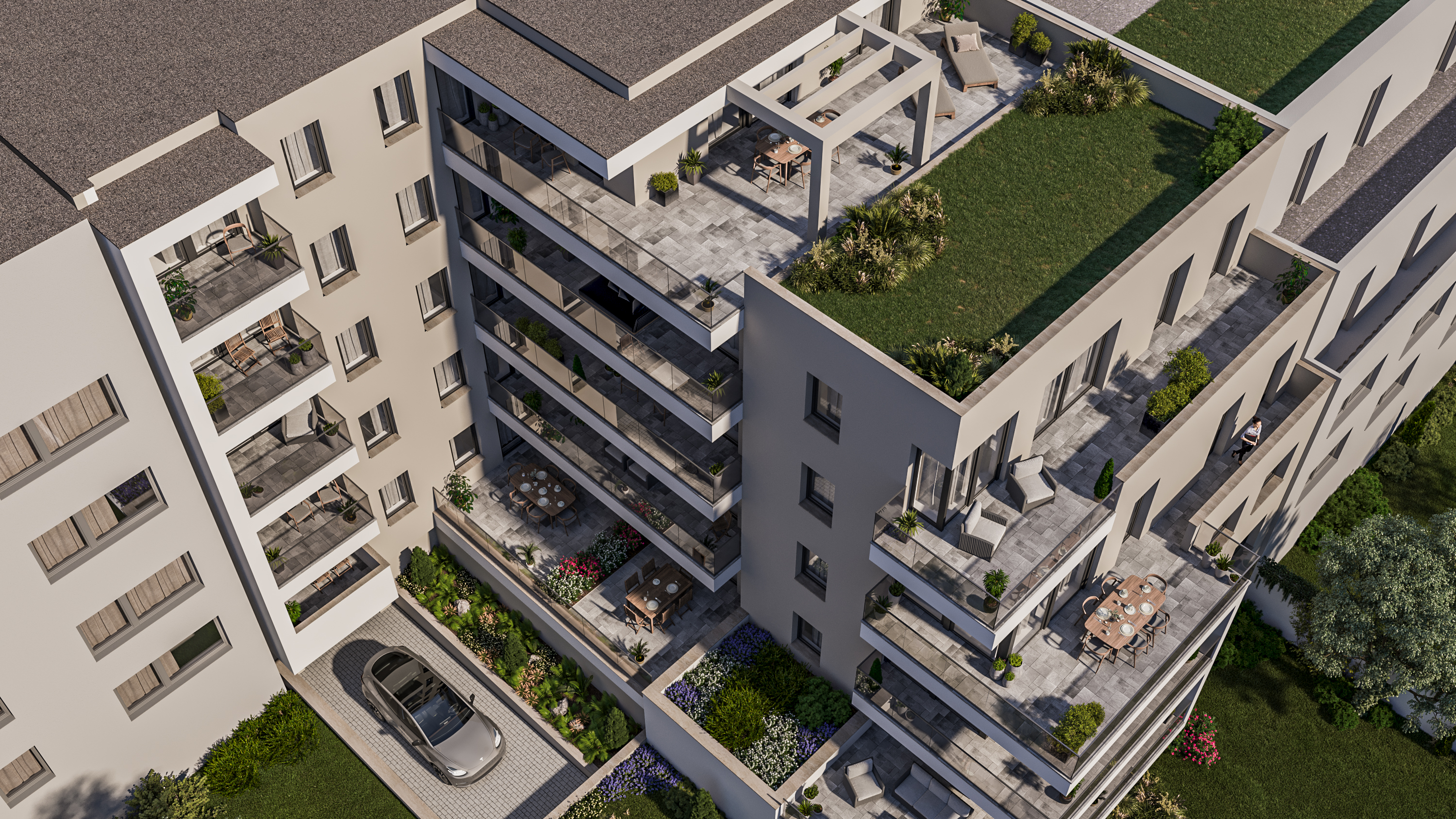 Az összképet kiváló minőségű térkővel burkolt bejáratok teszik teljessé. A társasház közös zöldterülettel rendelkezik.