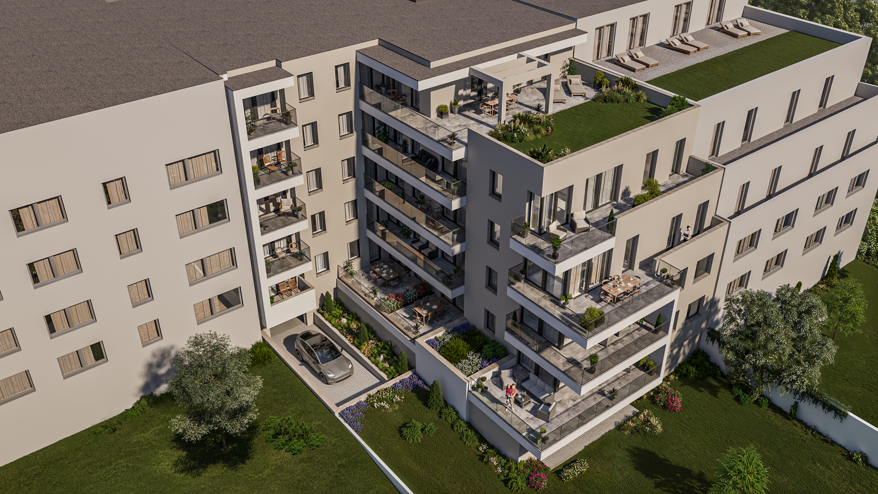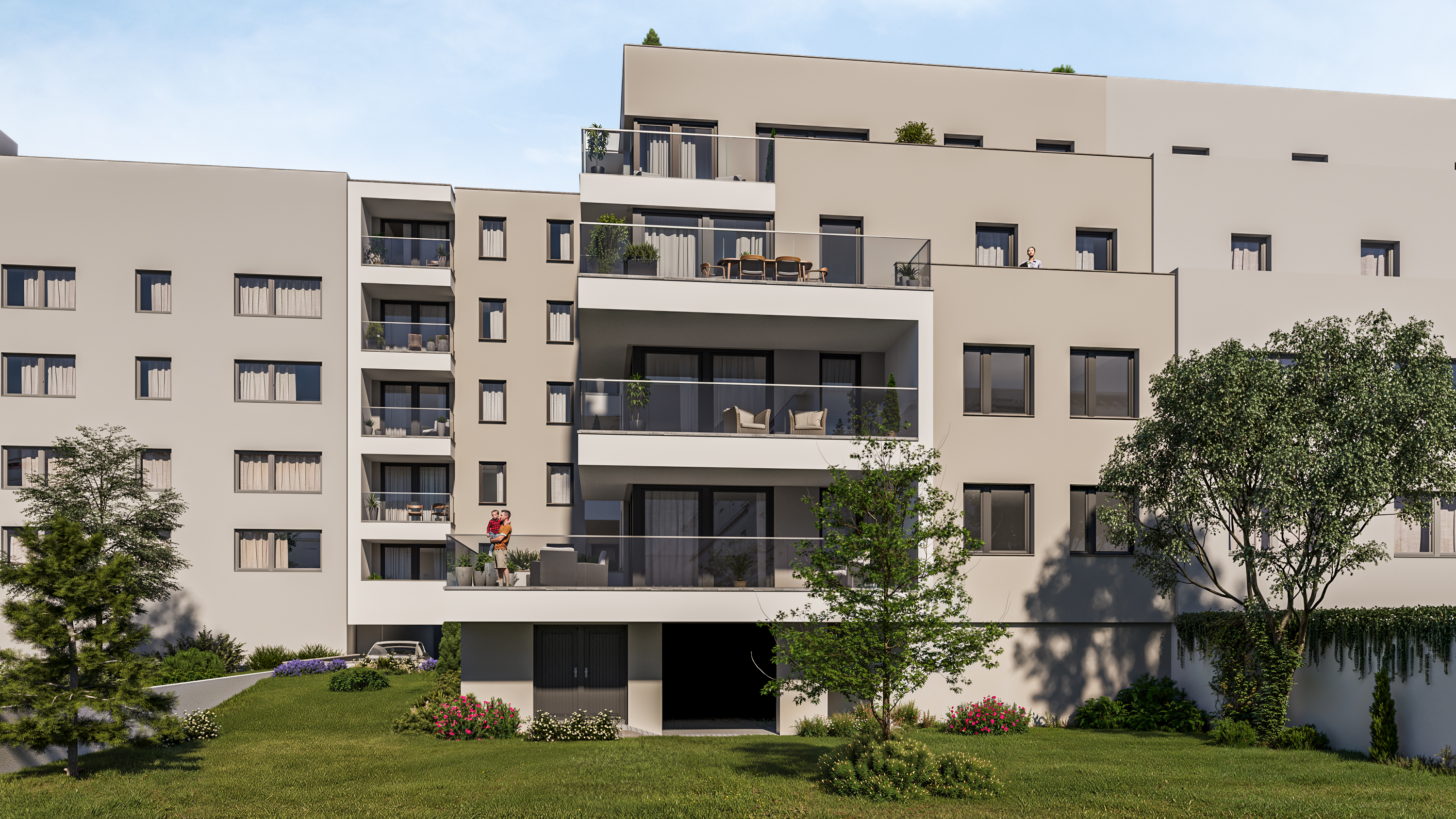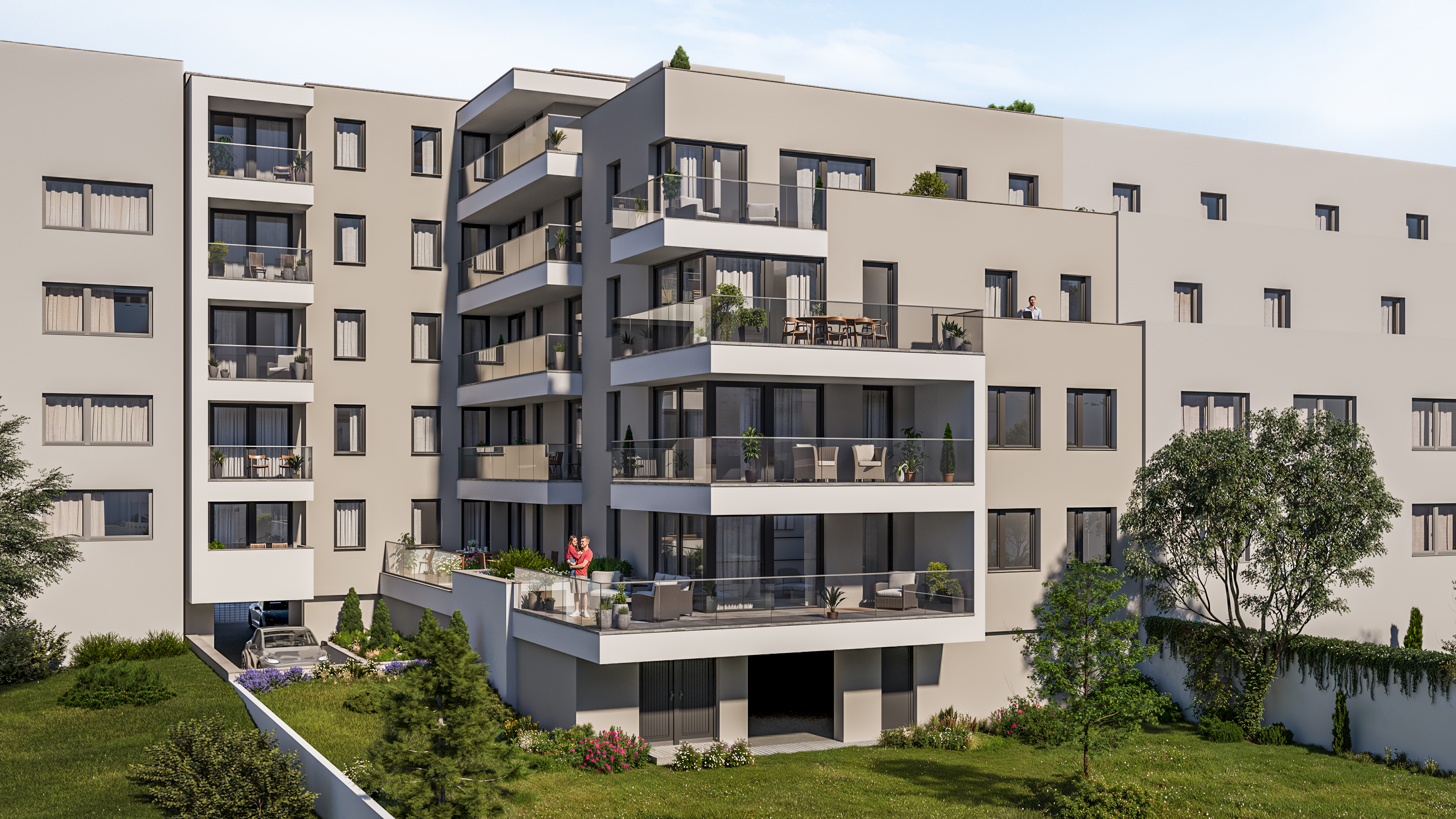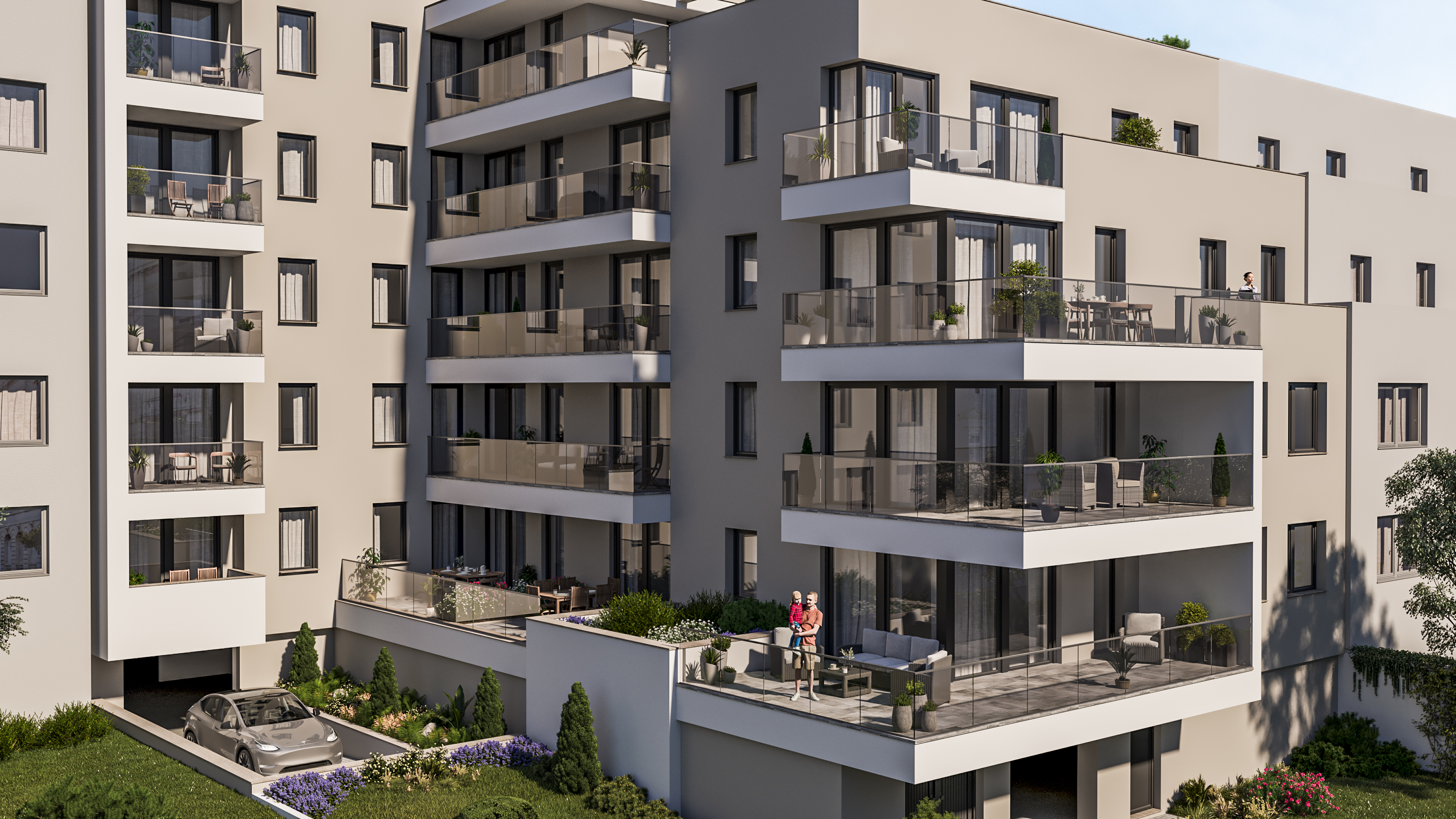 Az erkélyek fagyálló, csúszásmentes burkolatot kapnak, egyedi, lézervágott fémkorláttal.