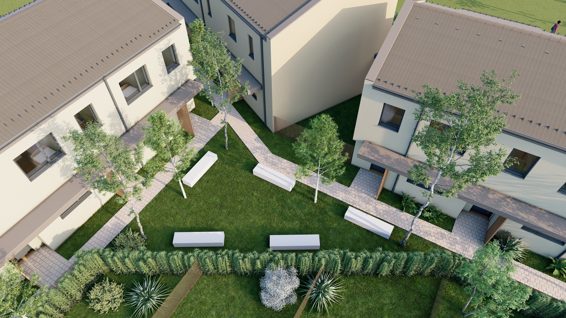 • Mindegyik lakáshoz tartozik saját kert/udvar. Némelyik lakásnak előkertje és oldalkertje is van. Az úgynevezett hátsó kertkapcsolat 180cm magas esztétikus kerítéssel körbe ölelt privát terület. A nappaliból lehet megközelíteni, kialakított teraszon keresztül.