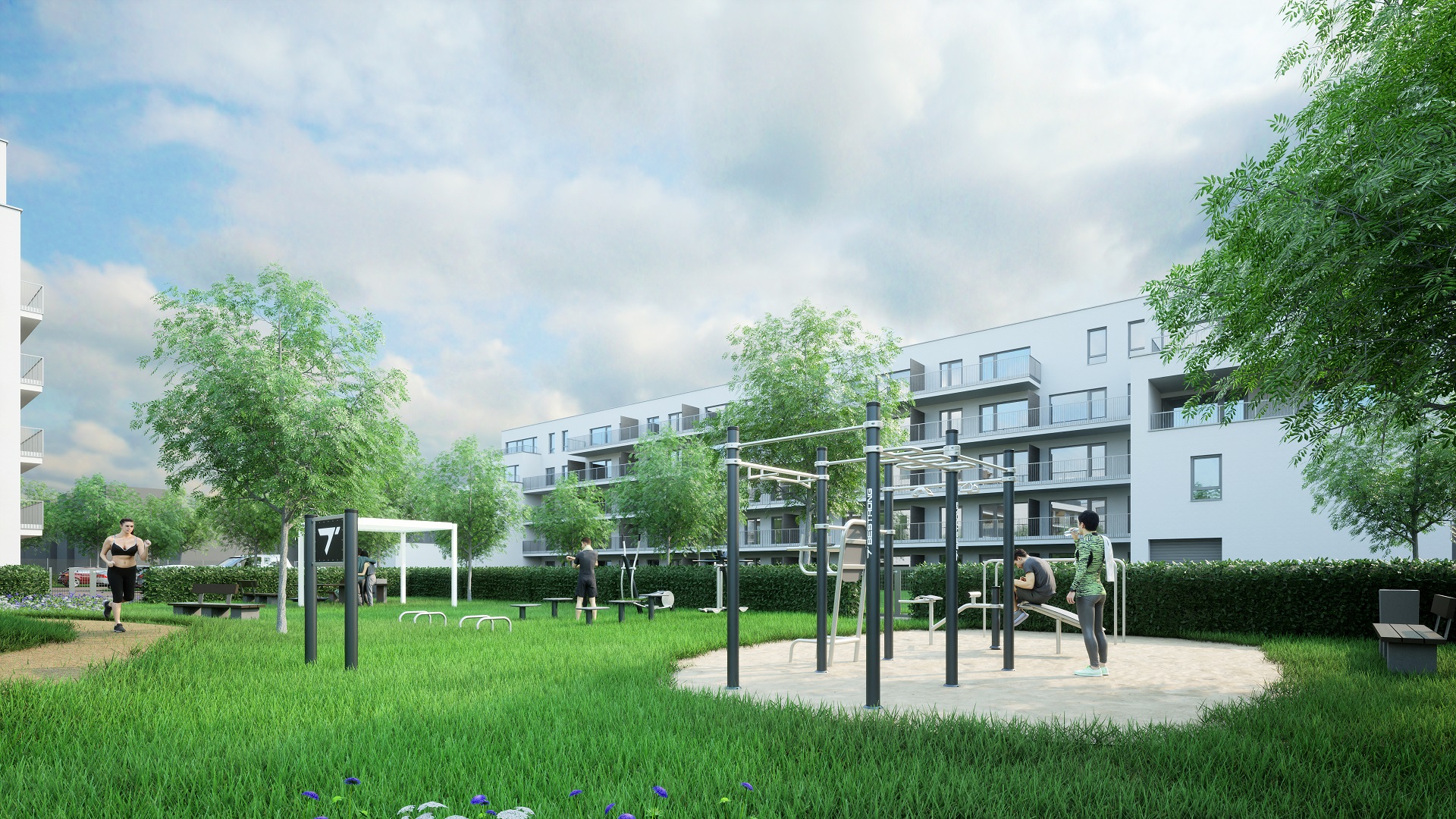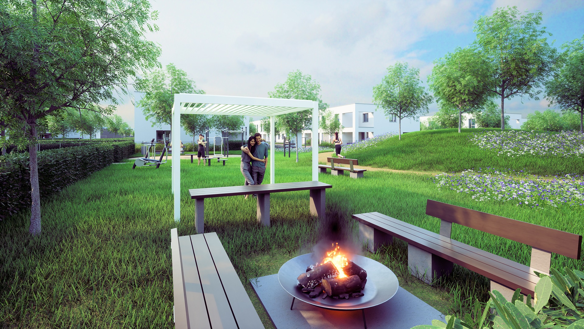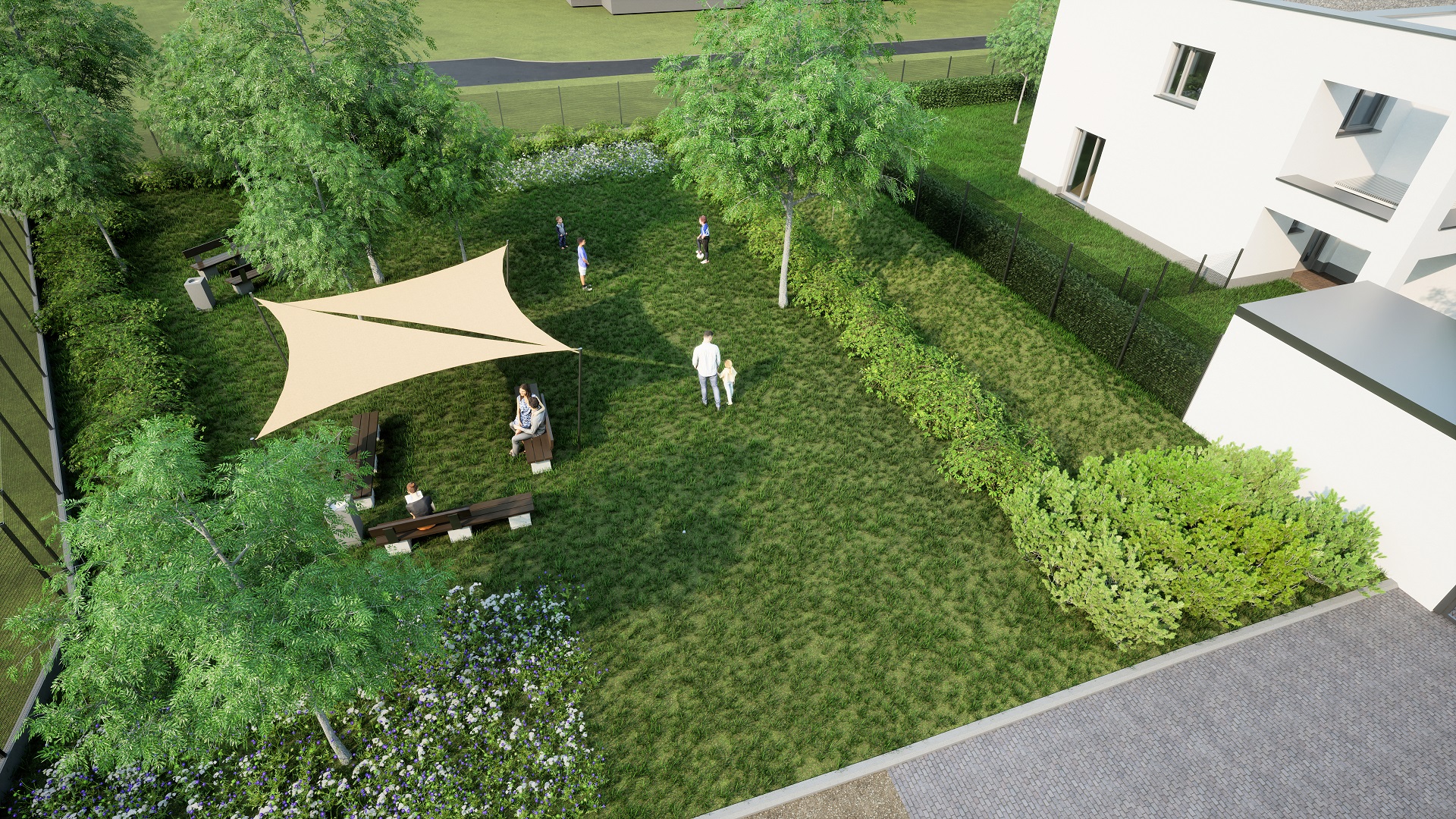 Az épületek tágas, növényzettel intenzíven telepített közös használatú pihenő- és rekreációs parkot ölelnek körbe, ahol napvitorlákkal védett kis játszótér, szabadtéri edzőeszközök, pergolákkal rendelkező kerti sütők, illetve csendes elvonulásra ugyancsak lehetőséget biztosító terek egyaránt megtalálhatóak.