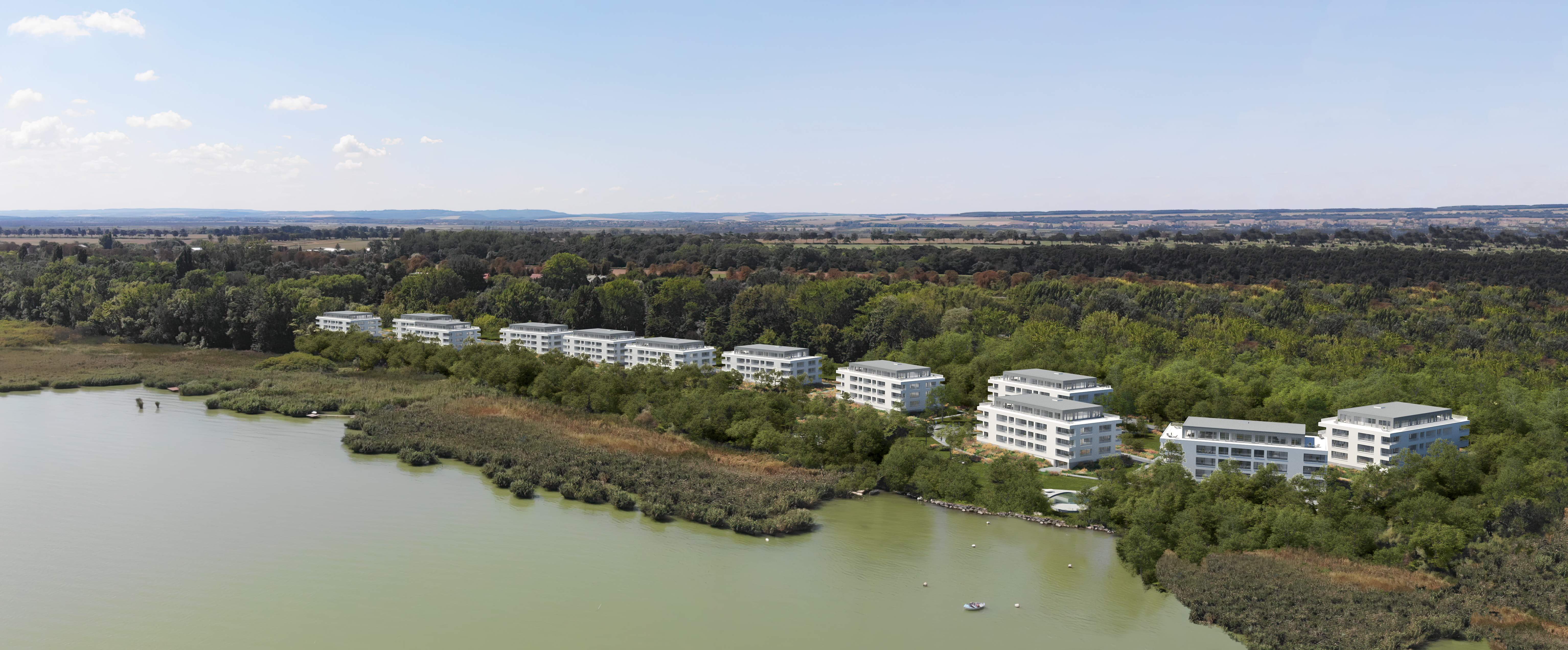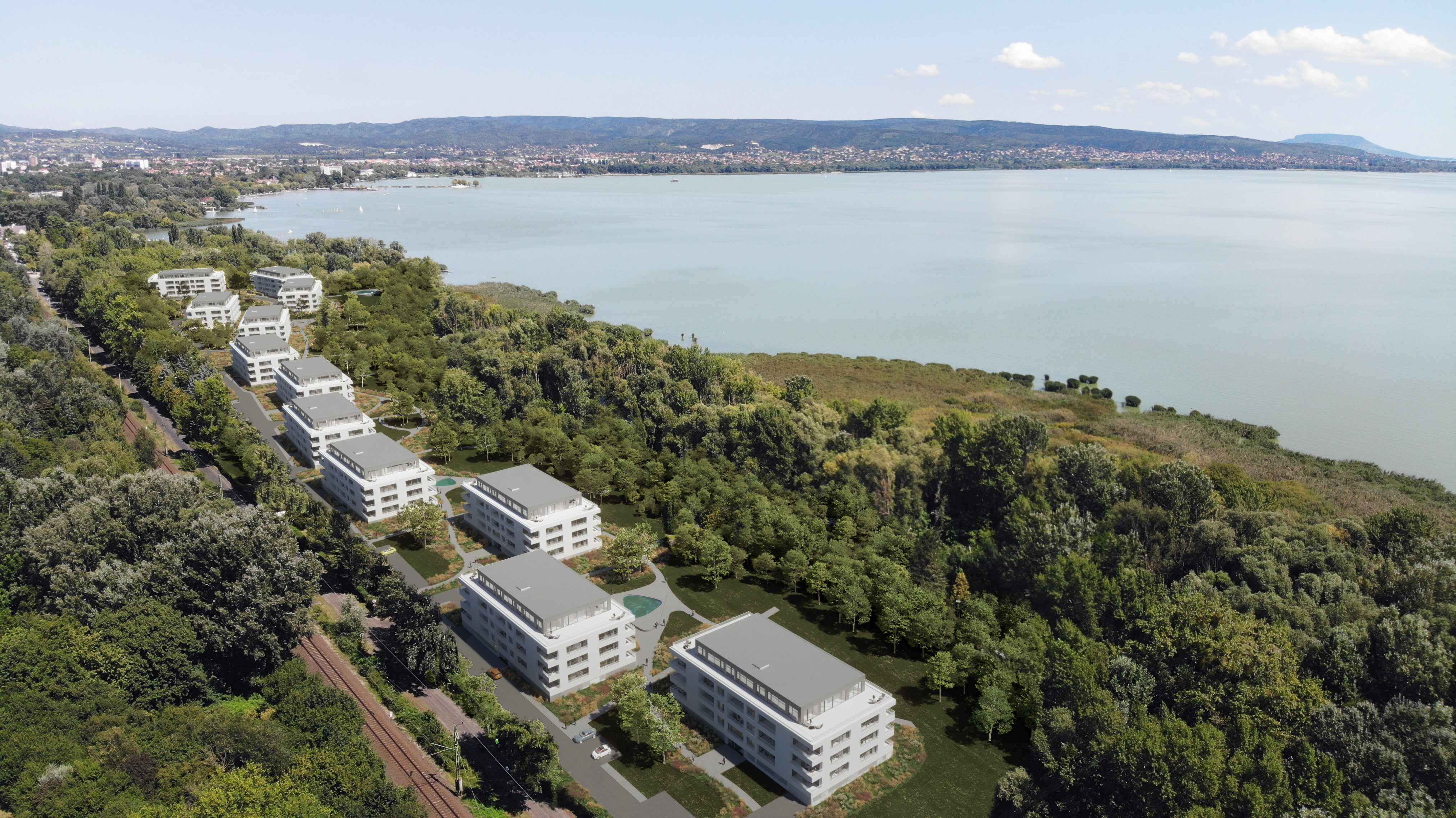 A Lake Resort, projektünk első ütemében 5, a második ütemben 7 házból álló 288 lakásos lakópark kerül kialakításra. A projekt első üteme 2022 első negyedévében kezdődött, kulcsrakész okosmegoldással kialakított lakások műszaki átadása 2023 második negyedévétől veszi kezdetét. A telek adta méreteinek és ősfás területének köszönhetően, gondozott parkok, játszó- és sport kertek, tanösvények, piknik/grillezéshez kialakított helyek, privát medencék és saját moló/stég nyújtanak felemelő kikapcsolódási élményeket. A területen megvalósuló Lake Resort lakópark a hely kiemelkedő adottságait kihasználva, könnyed, látványos építészeti megjelenésével harmonikus lakókörnyezetet teremt.