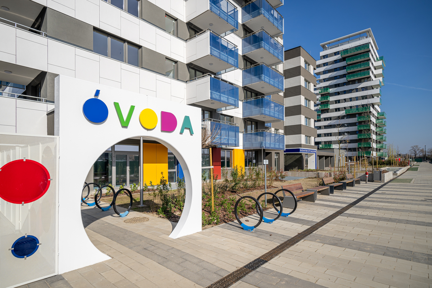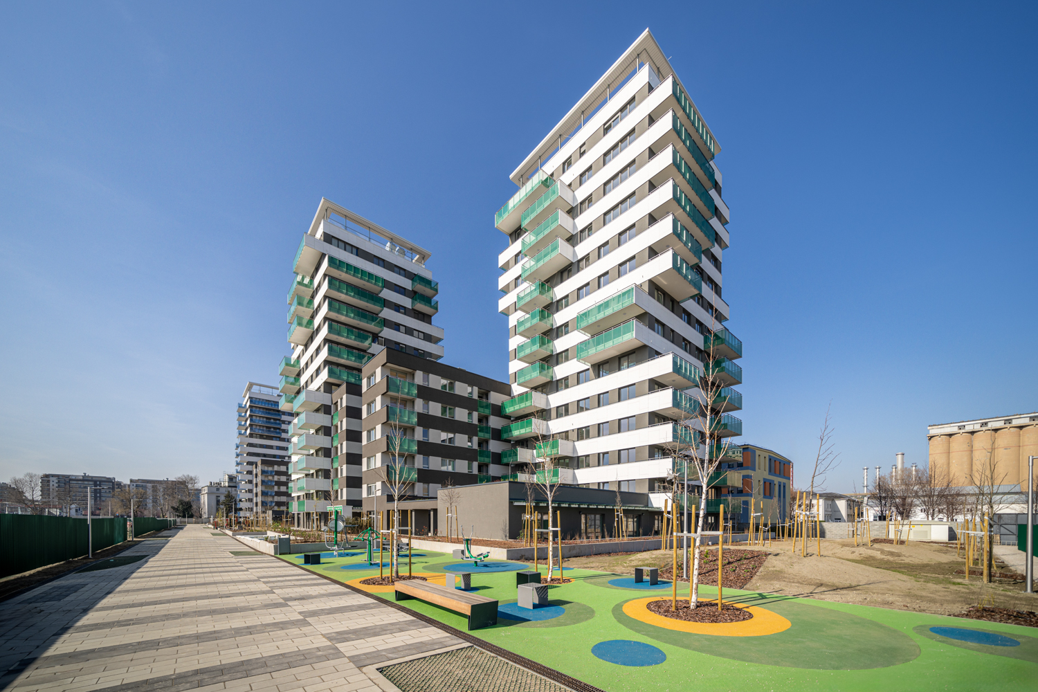 A lakópark háromhektáros területe teljes egészében mentes a gépkocsiforgalomtól, az autók a föld felszíne alatt kialakított mélygarázsokban parkolnak. Valamennyi autóbeállóhoz saját elektromosautó-töltőállomás tartozik, annak érdekében, hogy a lakópark évek múlva is megfeleljen a kor elvárásainak.
