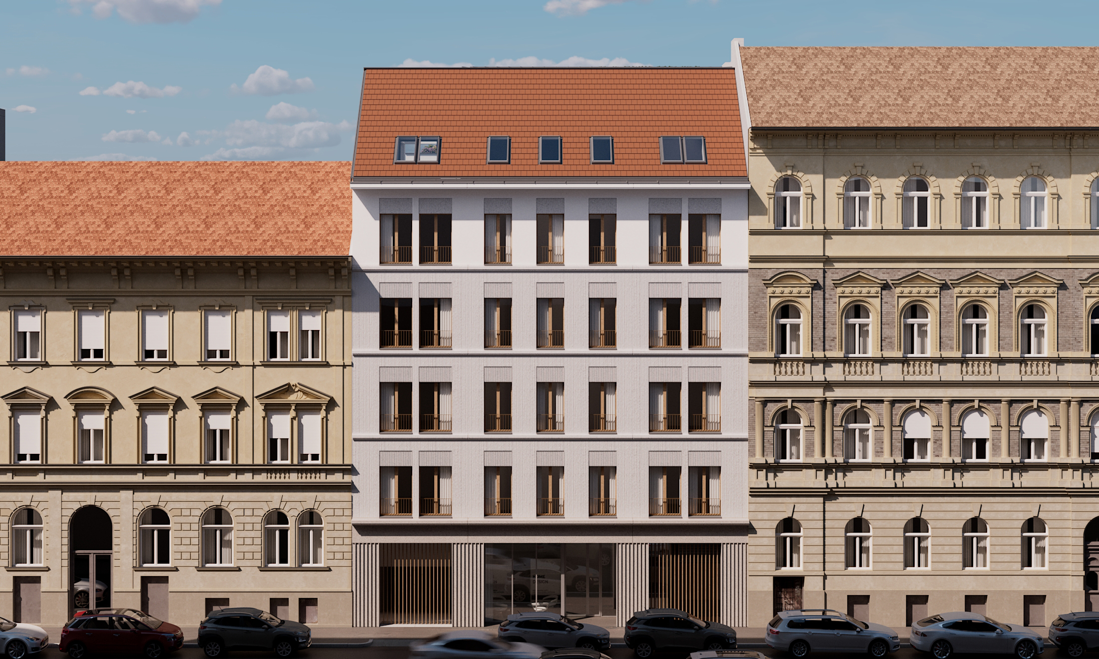 A földszint + 6 emeletes épület modern, mégis harmonikus megjelenésével illeszkedik a városi környezetbe. A pinceszinten 32 autó számára biztosítunk kényelmes parkolóhelyet, mely a belvárosban kiemelt fontosságú.