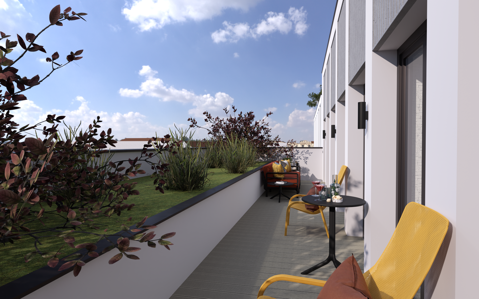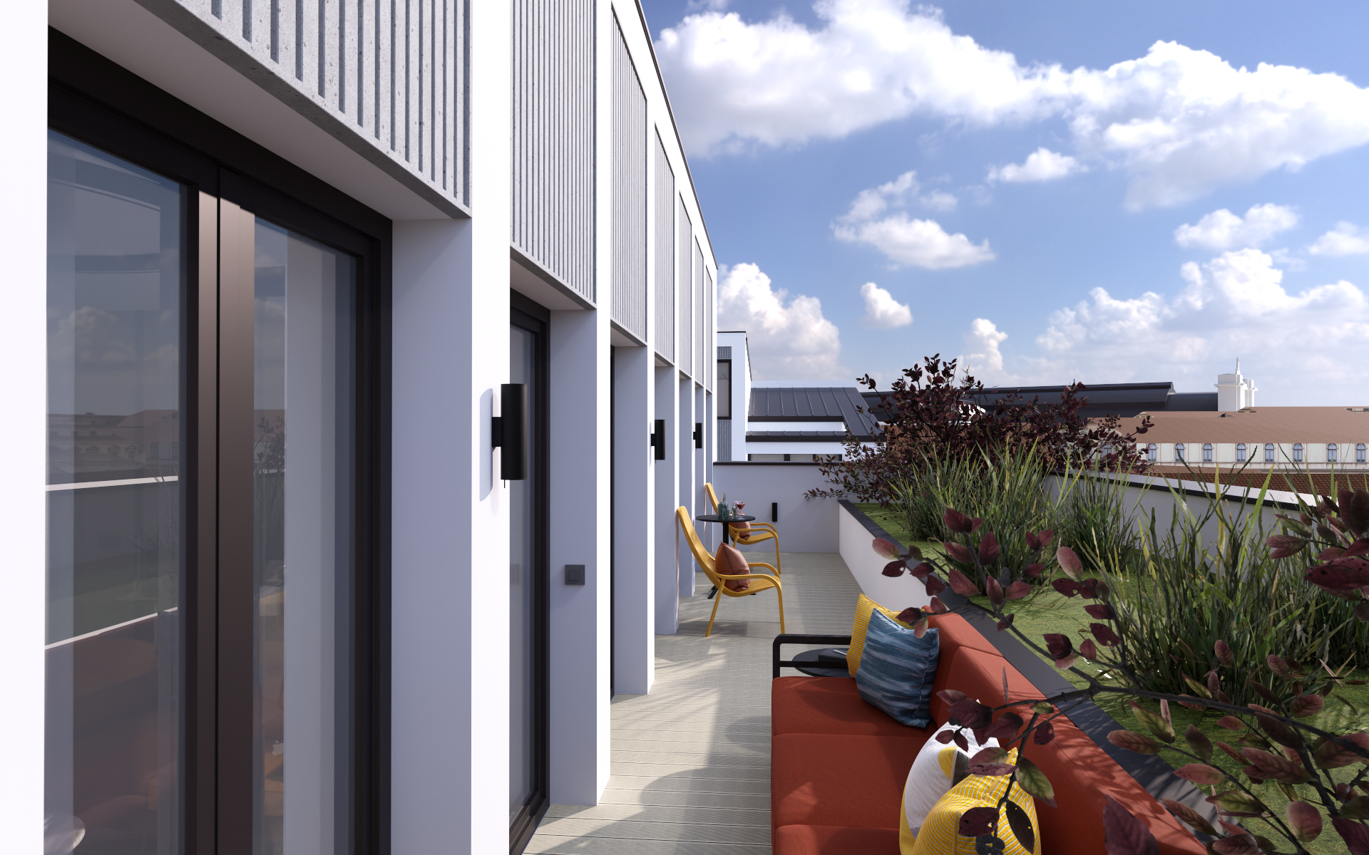 A földszinti lakásokhoz privát kertek, míg az emeleti otthonokhoz tágas erkélyek, loggiák vagy teraszok tartoznak, melyek praktikusan ellensúlyozzák a belvárosi zsúfolt beépítettséget. A két lépcsőház és a liftek könnyű megközelítést biztosítanak a lakószintekhez és a mélygarázshoz egyaránt.