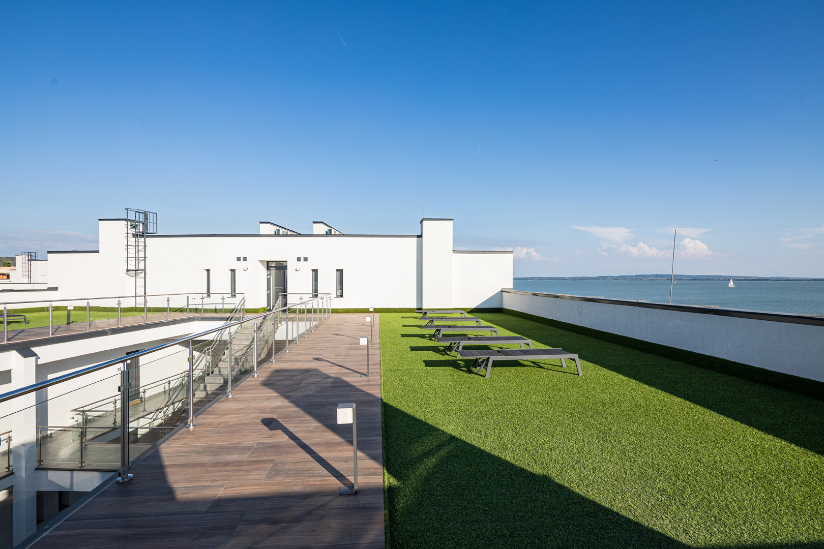 A Balaton parti elhelyezkedés mellett az épület különlegessége, a földszinten elhelyezkedő, belsőépítész által tervezett wellness. A kertben medence, az épület tetején szolár zuhanyos napozóterasz várja az új lakókat.
